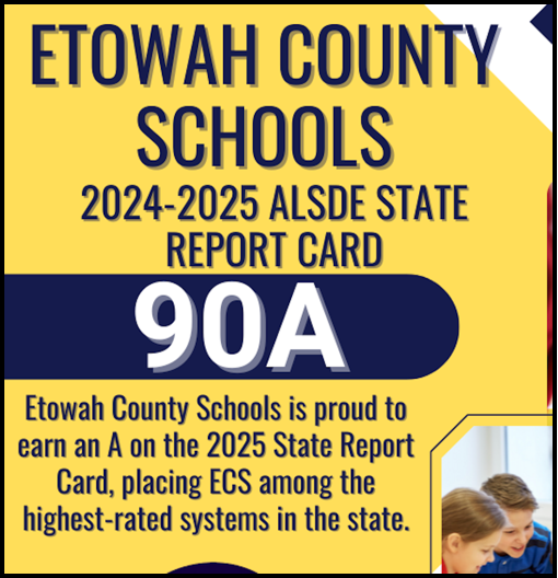 Archived District News12/13/2020 Meal Pickup Instructions04/27/2024 - Summer Professional Development4/11/2024 - Parent Survey 2020-21 Parent Guide for Reopening Etowah County Schools and Frequently Asked QuestionsSaturday, April 20, 2024-Etowah County School Foundation 5K Scholarship RunMarch Family Literacy ChallengeOctober 12, 2023-Numeracy November1/24/2024 - ECSF is Now Accepting Student Scholarship Applications2023-2024 Support Personnel of the Year2023-2024 Teachers of the YearSplash Into Summer Reading1/4/2024 - First Class Pre-K Registration January 15 - March 10Summer Learning Challenge1/6/2023 - Preschool Inclusive ClassroomsVerizon MiFi Checkout Form1/3/2024 - PreSchool Inclusive Classroom Screening Appointments12/14/2020 - AHSAA Indoor Athletic Events Update04/19/2021 - ECBOE Mask UpdateCOVID-19 VACCINATION INFORMATION12/2/2020 Alabama Broadband Connectivity for StudentsTeachingBooks8/10/2021 - 2021-2022 Back to School Guidance8/25/2021 - Mask PolicyHigh School Seniors Hiring FairEtowah County Schools Kindergarten Registration May 4, 2022Early Release-Veteran's Day ParadeMessageClimate and School Culture Parent SurveyEtowah County Schools In-Person Instructional PlanJanuary 6, 2022-Updated COVID Guidelines05/20/2022 - Make Time for Learning this Summer!2022 Etowah County School Foundation Scholarship RecipientsAttention Teachers: Summer PD ScheduleOctober 18, 2022-Etowah County Board of Education New Office Building Ribbon Cutting Ceremony9/28/2021 - Alabama Student Connect-We’re bridging the broadband gap in Alabama